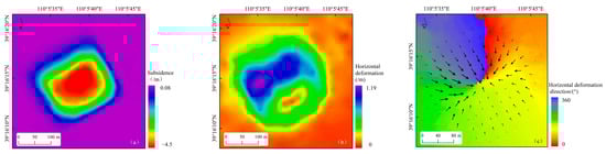 The components of the surface movement vector d in the vertical and horizontal directions are and , respectively. The projection of the surface deformation vector in the LOS direction corresponds to the deformation vector captured by InSAR monitoring. The equation below expresses the vertical deformation []: