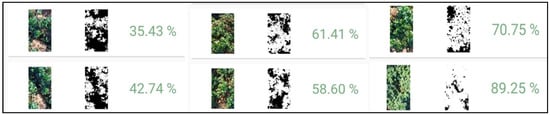 GCC was determined using Canopeo® v2.0, a mobile phone application that captures high-resolution digital images or video recordings of the canopy. The pixels of digital images or videos are classified based on the color ratios of red to green (R/G), blue to green (B/G), and an excess green index (2G-R-B) []. The resultant image of this classification is a black-and-white image, where the black pixels correspond to the non-green canopy, and the white pixels correspond to the green canopy (Figure 1). GCC was then quantified as a percentage ranging from 0% (0% GCC) to 100% (100% GCC) [].