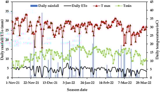 Daily weather data, including minimum and maximum temperature, relative humidity, solar radiation, wind speed, and rainfall, were recorded by automatic weather stations (AWS) installed at Fields 2 and 3. Tipping-bucket rain gauges were installed in each field in the WFS to record the amount of water supplied to the crops through rainfall and irrigation. Temperature data were used to calculate the growing degree days (GDD) from planting until vine killing using a base temperature (Tb) of 2 °C [] (Equation (1)).