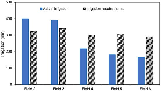 The Kc or Kcb values based on FGCC and NDVI are influenced by crop canopy growth and ground coverage, which depend on various factors, such as nutrient and water availability, the incidence of pests and diseases, and extreme weather conditions (frost and hail). These factors may result in reduced canopy coverage and affect crop reflectance properties, leading to errors in the observed GCC and NDVI values []. Moreover, prolonged periods of overcast sky hinder satellite imagery acquisition, which increases the uncertainty in the Kcb-NDVI profiles generated using interpolated NDVI over longer intervals []. During the current season, NDVI was not available on at least four dates for each field due to overcast conditions, and most of these days coincided with the mid-season stage. Johnson and Trout [] also mentioned that Kcb based on fractional cover is more sensitive to measurement errors during the linear phase (mid-season stage) of the Kcb curves.
