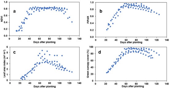 Remote sensing-based ET estimations require maximum values of NDVI, GCC, and LAI at full canopy cover []. Maximum NDVI of 0.85 at full canopy cover observed in the present study falls in the range of maximum NDVI of 0.8–0.9 reported for potatoes in previous studies [,,]. The observed peak value of GCC percentage was 95%, which was slightly higher than the mean value of 88% reported by Pereira et al. []. The mean maximum LAI at full canopy cover observed for all fields was about 3.5 m2 m−2 and was in line with LAI values reported for potato at full canopy cover [,], and other crops like soybean [] and wheat [].