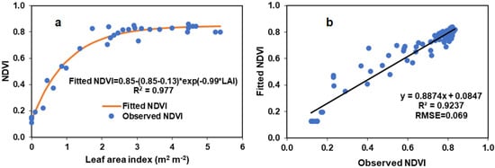 The coefficient N can be determined from field data of Tc and LAI (Equation (12)). In this study, Tc was not measured directly in the field, therefore, a median N value of 0.60 was used. The coefficient M was determined by fitting an exponential equation similar to Equation (13) from measured LAI and NDVI. The NDVI-LAI relationship was generated using data from Fields 1 and 2. The coefficients to the line of the equation were determined using the analysis function, solver, in Microsoft® Excel® 2019, which fits nonlinear functions by minimizing the residual sum of squares. The generated NDVI-LAI relationship was evaluated using an independent dataset from Fields 3–6.
