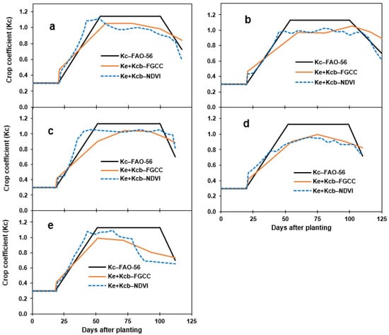 - In comparison with the FAO-56 approach, Kc values based on FGCC and NDVI were slightly lower during the mid-season season growth stage. However, the Kc profiles based on FGCC and NDVI represented actual crop development and were therefore expected to be more accurate than the FAO-56 approach.