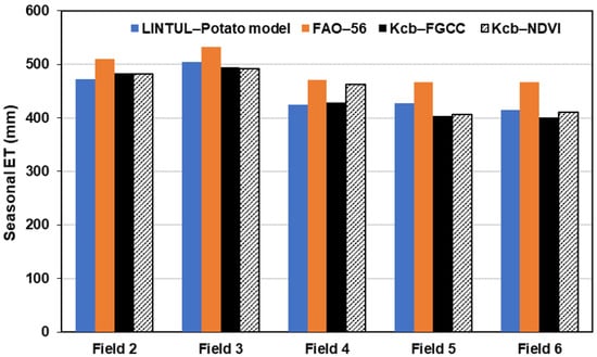- Seasonal ET based on the Kcb-FGCC and Kcb-NDVI approaches compared well with ET simulated by the LINTUL-Potato model. This suggested that Kcb-FGCC and Kcb-NDVI approaches offer alternative ways of estimating crop ET using readily available ETo and NDVI or canopy variable information. These results reinforce the utility of the modified analytical approach proposed by Choudhury et al. [] and modified by Campos et al. [] for potato ET estimation to facilitate irrigation management.