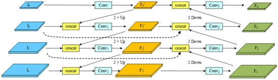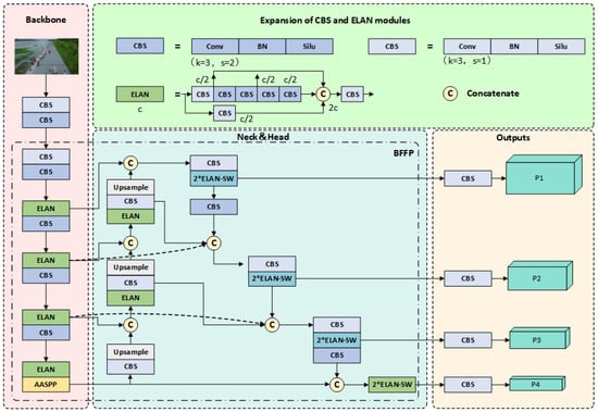 To simplify the description, we will refer to the ELAN module as the module and ELAN-SW as the module, as depicted in Figure 6. Our proposed BFFP module takes four feature maps extracted by the backbone network as inputs, denoted as from bottom to top. Among these, has the highest feature map resolution, while the subsequent feature maps have their resolutions halved. To enhance the framework’s ability to fuse multi-scale features and minimize framework complexity, we chose to incorporate bidirectional skip connections between the middle two layers of the module in our practical experiments. This allows us to effectively capture feature information across different scales while mitigating issues related to excessive parameter increase, model oversizing, gradient vanishing, and feature degradation. The process of fusing multi-scale features in the BFFP module can be described as follows: