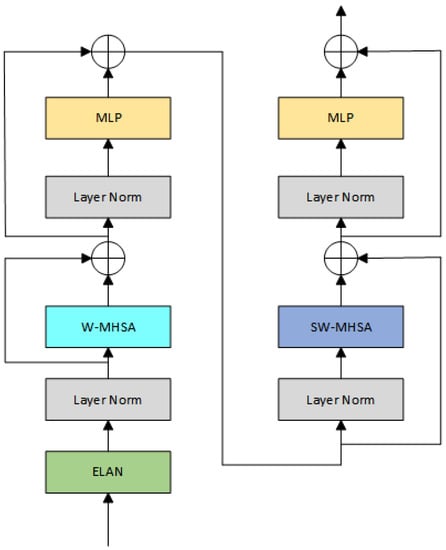 Moreover, the transformer model has powerful capabilities in modeling long-range dependencies, which aid in understanding the relationships and contextual information among objects, thus improving the accuracy and robustness of object detection. In UAV-captured images, due to the significant variations in object scales, traditional YOLO frameworks that solely rely on convolutional prediction heads often struggle to effectively detect objects of various sizes. Therefore, drawing inspiration from DETR [], we combine transformers with convolutional layers to serve as a novel prediction head in our model. Specifically, we connect and stack ELAN modules and Swin Transformer modules twice to generate the output. The structure of ELAN-SW is illustrated in Figure 2. Swin Transformer is a transformer-based method proposed in recent years. It improves the ability to capture contextual information and spatial information in images by introducing the window multi-head self-attention (W-MHSA) module and the shifted window multi-head self-attention (SW-MHSA) module. The W-MHSA module adopts the window attention mechanism, which divides the input feature map into windows to effectively model local information by calculating attention weights within each window. The SW-MHSA module utilizes the shifted window attention mechanism, which considers the relationship between adjacent windows to effectively capture local information. The Swin Transformer module manifests exceptional prowess in contextual modeling by integrating self-attention mechanisms and cross-window shifting operations. This integration enables the module to effectively capture context information at a global scale, thereby facilitating a deeper understanding of the relationships between objects and their surrounding environment. In addition to the benefits of the Swin Transformer, convolutional layers serve as traditional feature extractors with remarkable capabilities in local perception. They extract features from localized regions through sliding windows, capturing fine details and texture information of objects. By combining convolutional layers and Swin Transformer, we can fully leverage the advantages of both methods. This allows the model to consider both global and local information, resulting in an overall performance improvement.