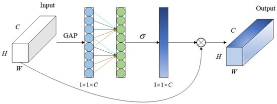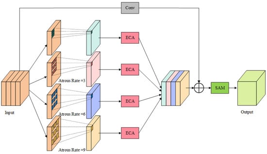 The AASPP module is incorporated at the end of the backbone network, similar to other pyramid pooling modules. Firstly, the AASPP module takes the feature map P, which is generated by the deep convolution of the backbone network, as input. It then performs convolution operations using convolutional kernels with different dilation rates, and four feature maps at different scales are generated, denoted as (i = 1, 2, …, 4). This step enables multi-scale feature extraction, which allows the model to effectively detect objects at various scales and achieve a balance and integration of information. Subsequently, each undergoes further feature enhancement through the use of the enhanced channel attention (ECA) module [], producing . The ECA module is illustrated in Figure 4. The output of each processed by the ECA module is denoted as follows: