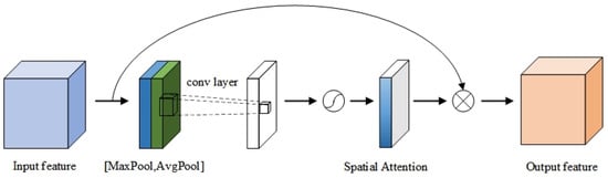 Furthermore, all are concatenated and then subjected to overall feature recalibration using the spatial attention module (SAM) []. The spatial attention module optimizes the channel representation of the feature map in an adaptive manner by compressing the channels and performing average pooling and max pooling operations in the channel dimension. Moreover, by calculating the importance weights of each pixel and applying them to every position of the feature map, the spatial attention module helps the network focus on the significant regions in the image. This step further enhances the model’s comprehension of the target position and context, resulting in the final output. The spatial attention module is depicted in Figure 5. The final output of the AASPP module, denoted as I, can be defined as follows: