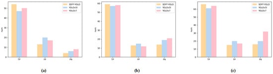Distribution of indicators (TP, FP, and FN) for three methods (YOLOv5l, YOLOv7, and SMFF-YOLO) in three scenarios: (a) Scenario 1; (b) Scenario 2; (c) Scenario 3. The yellow bars represent the results of SMFF-YOLO, the blue bars represent the results of YOLOv5l, and the red bars represent the results of YOLOv7.
