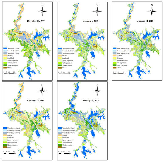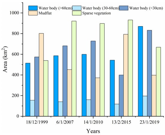 From 1999 to 2019, the area of water bodies with a depth of >60 cm, 30–60 cm, and <30 cm and sparse vegetation increased in Poyang Lake, and the area of mudflats decreased (Figure 3). The area of habitat with water bodies with a depth of >60 cm first increased by 69.06%, decreased, and then increased. The area of habitat with water bodies with a depth of 30–60 cm increased by 26.27%, and little variation was observed throughout the study period. The area of habitat with water bodies with a depth of <30 cm increased by 44.93%, and this change was consistent with observed variation in the area of habitat with water bodies with a depth of >60 cm. The area of habitat with mudflats decreased by 50.46% over the study period, but it first decreased, increased, and then decreased. The area of sparse vegetation increased by 23.85% over the study period, but it first increased and then decreased (Figure 3).