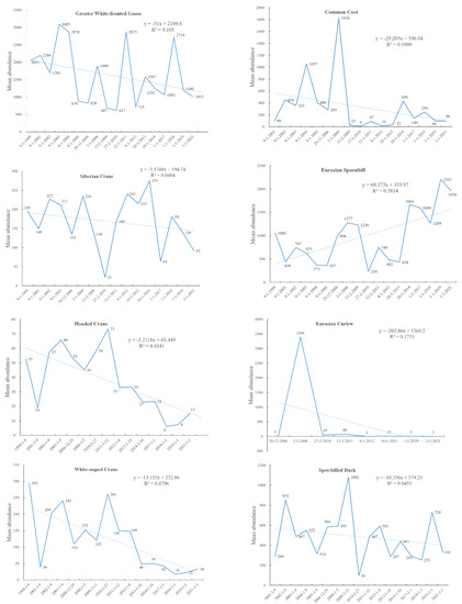 Consistent with the results of previous studies, Poyang Lake provides an important wintering site for multiple globally threatened waterbird species, especially the Siberian Crane, Oriental White Stork, Hooded Crane, White-naped Crane, and Swan Goose [7]. No significant changes were observed in the mean abundances of most species and foraging groups over the last 20 years, and the mean abundance was higher in the first year (1999) than in the last year (2021); these findings were not consistent with the observed increases in population size for most species in [13]. This might be explained by the lack of consistency in the survey periods and differences in data sources. Waterbird population data between 1997 and 2014 were collected using books, reports, and papers in the work of [13], whereas systematic surveys between 1999 and 2021 were conducted in this study. The mean abundances of the dominant species Hooded Crane and White-naped Crane significantly decreased. The mean abundances of the Bean Goose and Grey-lag Goose significantly increased; these findings were consistent with the results of [13].
