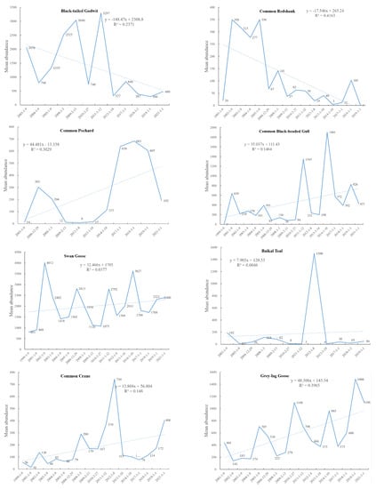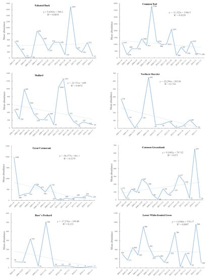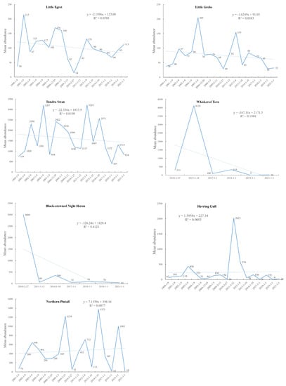 Long-term abundance trends were analyzed using linear trend-fitting models at the 5% significance level in IBM (International Business Machines Corporation, New York, NY, USA) SPSS (Statistical Product and Service Solutions, Chicago, IL, USA) Statistics 22.0 software. The goodness of fit of the models was assessed on the basis of the p-value, and p < 0.05 indicated a good model fit with significant trends. We considered a species and foraging group to be declining if the percentage change was negative and the linear trend-fitting model revealed a significant declining trend.