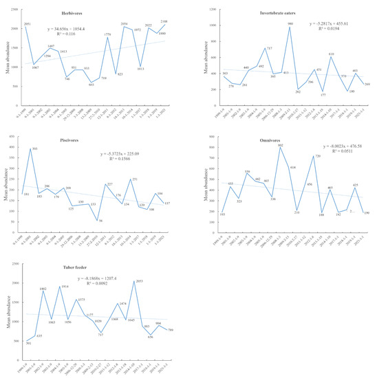 Figure 2. Linear trend fitting of mean abundance at the species and foraging group level.