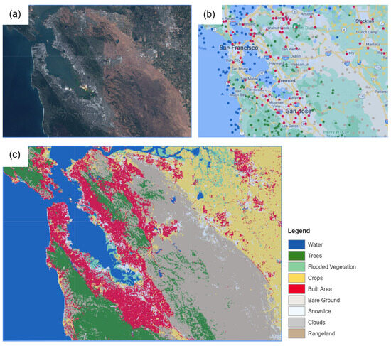 Figure 3 shows three snapshots in the land cover classification process for a focal region around San Francisco Bay. The natural color (Figure 3a, red/green/blue) composite image was obtained from the Sentinel-2 Level-2A imagery for the entire year of 2021. The labeled data (Figure 3b) were generated by stratified sampling (100 samples for each class) of Esri’s global land cover product [44]. The spectral bands in Sentinel-2 (B2–B5, B8, B9, B11, and B12), two spectral indices (NDVI and NDWI), and two topographic variables (elevation and slope) from the NASA SRTM V3 product were selected as the predictor variables. An RF classifier was trained, and the composite image was classified as shown in Figure 3c. The RF model was chosen because, as reported in [5], it is the most robust and widely used ML model available on GEE for various Earth observation-based applications (e.g., wetland mapping and wildfire). The labels histogram, the parallel coordinate plot, the classifier metrics and the confusion matrix, and the zonal areas for each land cover are available for review as well.