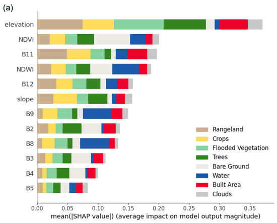Accurate and timely land use land cover (LULC) maps are essential tools for informed land management decision making. With the increasing availability of RS data, the need for high spatial and temporal resolution land cover maps is ever-increasing. Furthermore, these maps need to be tailored to the area of interest and accommodate the inherent heterogeneity of the land surface, which would result in different categorical LULC classes across different geographical and ecological conditions. Nowadays, there is a growing trend towards open-source tools, which require limited technical skills to extract tailored information for a specific area of interest (AOI) [31,32,33]. In the context of land cover mapping with GEE, two such tools are available: REMAP [34] and O-LCMapping [35]. They were implemented primarily in JavaScript, and it is not very straightforward and intuitive for other researchers and practitioners to adapt them to solve their domain problems. Both tools [34,35] excluded feature importance analysis in their workflows. In addition, in the AI setting, Python is the primarily used language, and it has more open-source resources for Earth observation researchers to better apply AI to solve their domain problems using GEE and XAI. While the popular SHAP model has already been applied to various geohazards mapping studies [23,24,25], it has seldom been applied to multi-label land cover mapping studies [22,36].