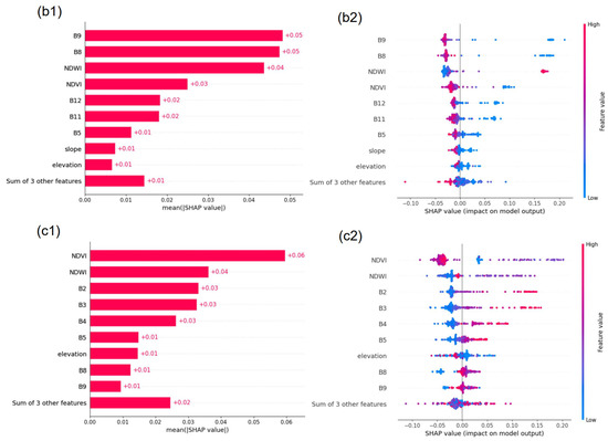 Figure 5. SHAP values plots for all of the testing samples. (a) Global feature importance for all of the land cover classes. (b1,b2) Global feature importance and local explanation summary for class “Water”. (c1,c2) Global feature importance and local explanation summary for class “Bare Ground”.