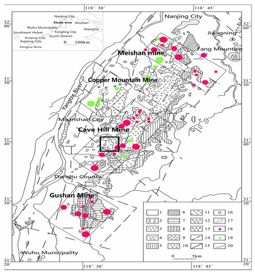 Figure 1. Geological and mineral resources diagram of the Ningwu Basin (cited from [24]). 1. Quaternary; 2. Niangniangshan Formation volcanic rocks; 3. Gushan Formation volcanic rocks; 4. Dawangshan Formation volcanic rocks; 5. Longwangshan Formation volcanic rocks; 6. Upper Jurassic; 7. Middle and Lower Jurassic; 8. Triassic; 9. Gabbro-diorite porphyrite; 10. Andesitic porphyrite, crude porphyry, trachyte porphyry; 11. Monzonite and quartz diorite; 12. Granite; 13. Gabbro; 14. Inferred fault; 15. Measured fault; 16. Volcano; 17. Concealed speculation according to geological drilling; 18. Iron deposit; 19. Copper deposit; 20. Ore field boundary.