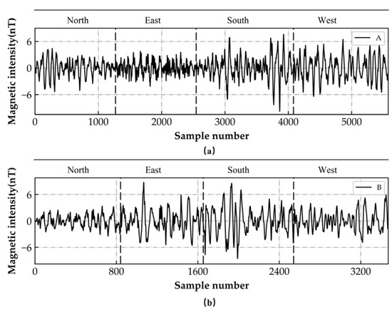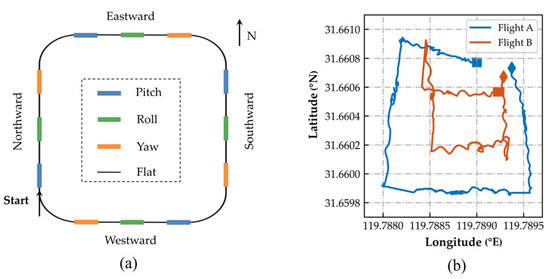 To validate the method proposed in this research, the study refers to a FOM flight experiment designed by Leliak [7]. This experiment obtains the magnetic interference data generated during the flight process by flying in a specific way and brings it into the magnetic interference compensation model. The compensation parameters are solved through compensation algorithms. Compensation parameters are applied to another set of flight data for compensation processing. As shown in Figure 5a, the FOM flight includes maneuvers in four directions: north, east, south, and west. Each direction undergoes ±5° yaw, ±5° pitch, and ±10° roll attitude maneuvers, with a duration of 5–10 s for each attitude and a 5 s flat between each group of attitudes. The actual FOM flight paths for flights A and B are shown in Figure 5b; a square represents the beginning of the flight, and a diamond represents the end of the flight. The magnetic interference data measured by the optical pumping magnetometer installed on the aircraft during the flight are shown in Figure 6.