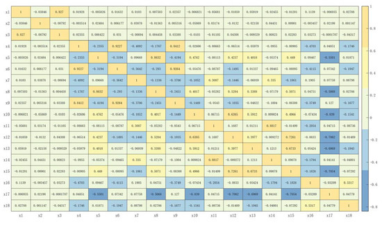 Firstly, the correlations between variables are analyzed in the T-L model. Here, a thermodynamic diagram (Figure 7) is used to display the correlation between variables visually. The numbers on the graph represent the correlation coefficient matrix, and different colors represent varying degrees of correlation. The closer the correlation coefficient is to 0, the lighter the color is, and the more irrelevant the variables are. The closer the correlation coefficient is to 1 or −1, the darker the color and the higher the degree of linear relationship between variables. Therefore, it can be seen that there is a high correlation between the compensation model variables X , indicating the existence of severe multicollinearity in the T-L model.