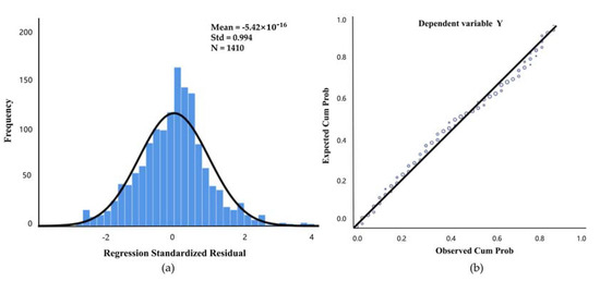 Figure 8. (a) Residual histogram of the regression model; (b) normalized P-P plot of the regression normalization residuals.