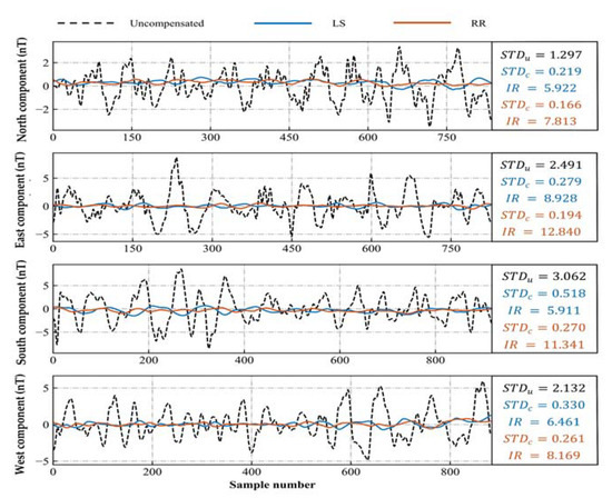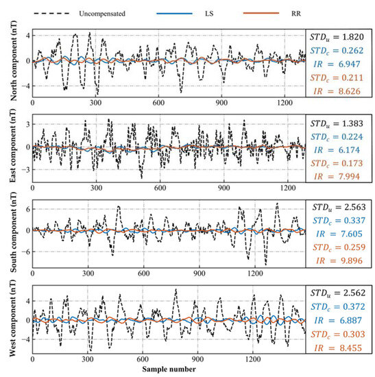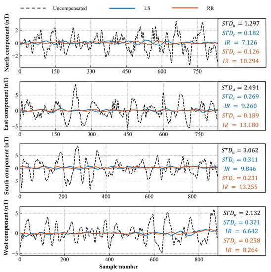 Similarly, flight B is used as a calibration flight, flight A as a test flight, and magnetic compensation is performed using the adaptive modeling-based aeromagnetic compensation algorithm. Figure 11 and Figure 12 show the compensation results of flight A using the LS and RR algorithms for the T-L and heading models, respectively. Compared to LS, RR reduces the compensated STD and increases the IR. RR is different from LS unbiased estimation, as its estimated partial regression coefficients are often closer to the real situation and have better fitting ability. When using the RR algorithm for compensation, the heading model compensates for a smaller STD and a larger IR than the T-L model. This shows that the adaptive modeling algorithm reduces the multicollinearity between variables in the T-L model, improves the performance of the regression algorithm, and improves the accuracy of aeromagnetic compensation. Similarly, when using the LS algorithm, the compensation effect of the heading model is better than that of the T-L model. The above experiments show that the heading model obtained through adaptive variable allocation has a higher regression ability than the traditional T-L model, and the compensated magnetic interference has less error and a higher improvement ratio. This shows that the method effectively solves the ill-conditioned problem of the model caused by multicollinearity, thus improving the compensation accuracy and confirming the effectiveness of our proposed algorithm.