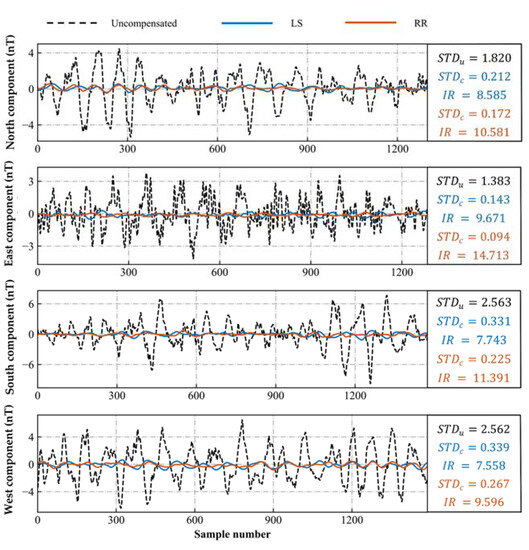 In the previous section, a heading model with strong regression ability was obtained, and then flight B was compensated after solving for the compensation coefficient. Figure 9 shows the compensation results of the T-L model using the LS and RR algorithms for flight B, and Figure 10 shows the results of the adaptive established heading model. Taking the north heading as an example, when compensated using the LS algorithm, the T-L model reduces the STD from 1.297 to 0.219, and the IR is 5.922. The heading model lowers the STD to 0.182, and the IR is 7.126. Using the RR algorithm for compensation, the T-L model reduces the STD from 1.297 to 0.166, and the IR is 7.813. The heading model lowers the STD to 0.126, and the IR is 10.294. It can be seen that the IR of the heading model is higher than that of the T-L model, which can effectively weaken the influence of multicollinearity and achieve high-precision aeromagnetic compensation. The fitting ability of RR is stronger than that of LS, with higher compensation accuracy and stronger stability.