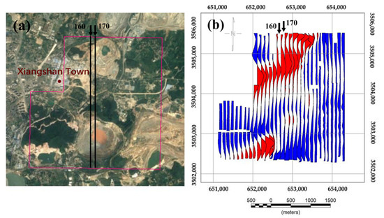 Figure 13. (a) Satellite remote sensing images of the survey area; the 160 and 170 measuring lines are the two required lines for this experiment; (b) original magnetic anomaly plane section.