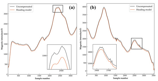 Figure 15. (a) The original magnetic anomaly; (b) the compensated magnetic anomaly.