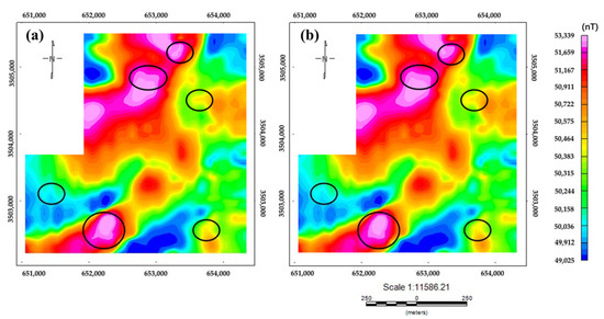 The compensation results of the measuring line are shown in Figure 14. It can be seen that the compensated signal is smoother than the original signal because the adaptive modeling compensation method eliminates the aeromagnetic maneuvering noise, so the obvious sawtooth interference in the measurement line is compensated. Applying this algorithm to all line data, according to the magnetic anomaly map of the original data (Figure 15a), it can be seen that there are some obvious magnetic anomaly areas. Some local anomalies correspond to known mineral deposits in the region. However, there are many serrations, ellipses, protrusions, and other forms of high-frequency anomalies distributed throughout the entire anomalous area. Part of these are caused by maneuvering noise during the aeromagnetic measurement process, which can affect the resolution of the magnetic anomaly map and increase the inaccuracy in subsequent inversions. As shown in the circular part of Figure 15b, the method proposed in this article was used for compensation processing to eliminate high-frequency anomalies in the region, especially in the southwestern region where the local anomaly shape is more pronounced. The range of magnetic anomalies is made clearer and smoother, providing better data for subsequent data inversion and interpretation combined with geological data.