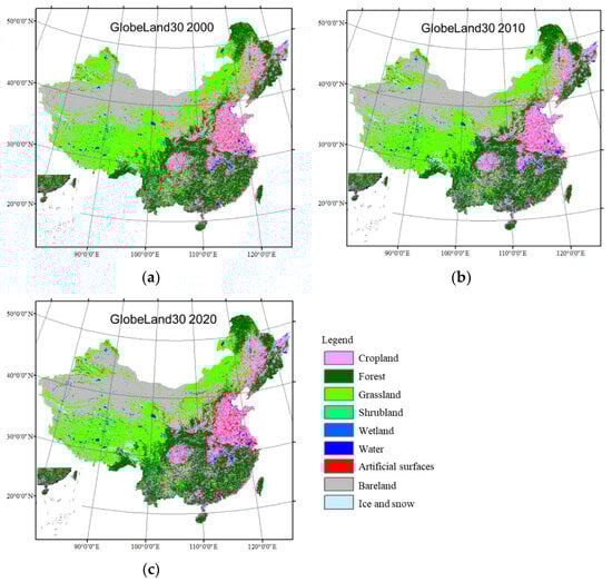 GlobeLand30 data in China for (a) 2000, (b) 2010, and (c) 2020.