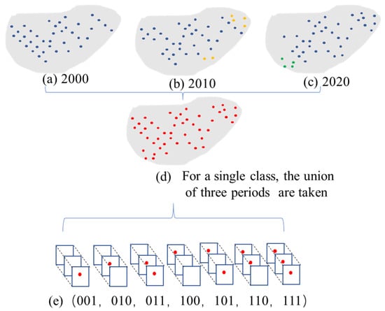 The flowchart of spatiotemporal stratified sampling. (a) Land cover class in 2000, as shown by the blue dots; (b) land cover class in 2010 (yellow dots indicate the new pixels of the similar classes when compared to 2000); (c) land cover in 2020 (green dots indicate the new pixels of the similar classes when compared to 2010); (d) the three periods of land cover taken and combined together, as shown by the red dots, and (e) the spatiotemporal stratified sampling. (001–111 is the binary code of the spatiotemporal stratification of each land cover class corresponding to Table 2).