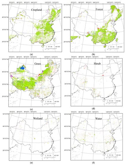 The overall accuracy was estimated for the land cover products of three time periods, and this was achieved by taking into account the specific types of the binary map of changed and non-changed land cover. For example, the overall accuracy of the types of change and unchanged cropland from 2000 to 2010. This gives the overall accuracy of the combination of the changed and unchanged types of cropland over three time periods: 2000–2010–2020.