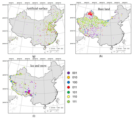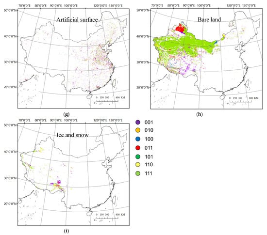 Spatiotemporal stratification of each class (001–111 is the binary code for the spatiotemporal stratification for each land cover class corresponding to Table 2). (a) Cropland; (b) Forest; (c) Grass; (d) Shrub; (e) Wetland; (f) Water; (g) Artificial surface; (h) Bare land; (i) Ice and snow.
