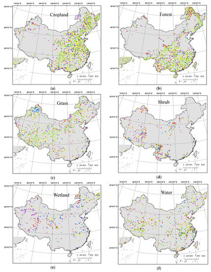 Firstly, the multi-temporal and multiclass land cover data are listed separately for each class in each period (Figure 3a–c), and the three-phase data of the same land category are combined as candidate samples (Figure 3d). The GlobeLand30 data in China with nine land cover categories were divided into nine types of sample candidate regions.