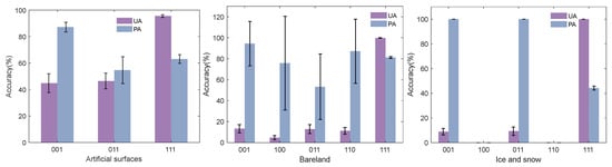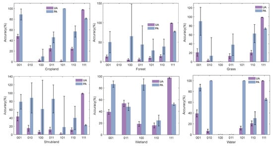 User accuracy and producer accuracy of the spatiotemporal stratified sample of each class. The error bars refer to the error of the estimated parameter with 95% confidence intervals. (001–111 is the binary code of the spatiotemporal stratification for each land cover class corresponding to Table 2).