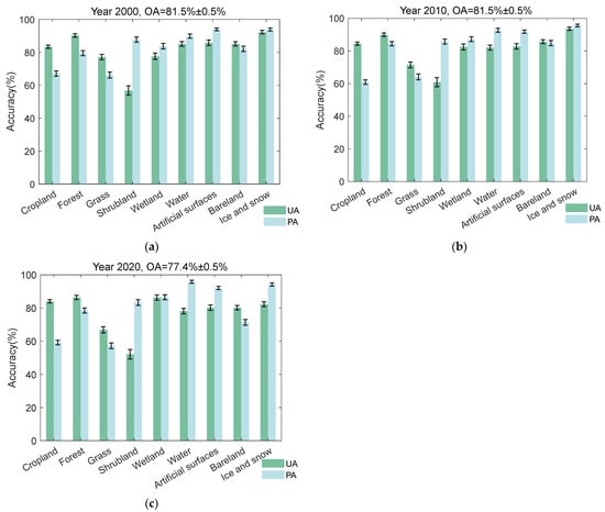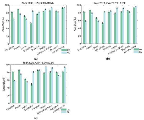 The accuracy of the period contains all of the strata of each class, as shown in Figure 7. In this case, the sample data of strata 100, 101, 110, and 111 were considered in 2000, the sample data of strata 011, 010, 110, and 111 were considered in 2010, and the sample data of strata 001, 011, 101, and 111 were considered in 2020. The overall accuracy (OA) was 80%, 79%, and 76.2% for 2000, 2010, and 2020, respectively (Figure 7). Since the user accuracy and producer accuracy of shrub and wetland are rather low, the increasing area proportion of these two classes leads to a decreasing overall accuracy over time. The standard error of the OA was less than 1% regardless of the time period. The UA values for cropland, forest, artificial surfaces, bare land, and ice and snow exceeded 80%. The UA and PA for 2000, 2010, and 2020 exceeded 60% for all classes except the UA for shrub. The PA of shrub, water, artificial surfaces, and ice and snow in the three periods is greater than the UA. The UA for cropland, forest, grass, and bare land in the three periods is greater than the PA. However, the standard error of the cartographic accuracy was greater than the standard error of the user accuracy for many categories, such as the water, artificial surfaces, and ice and snow regions, suggesting that the classifiers used to produce data products performed poorly in these land cover classes.