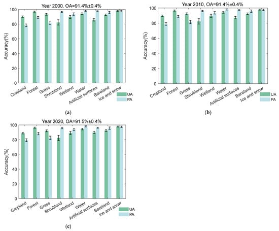 The combined accuracy of the three periods according to stable and unchanged strata. (a) Year 2000, OA = 91.4 ± 0.4%. (b) Year 2010, OA = 91.4 ± 0.4%. (c) Year 2020, OA = 91.5 ± 0.4%.