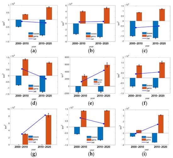 To estimate the proportion of the area of the 2000–2010 and 2010–2020 land cover changed for each class, e.g., gain, loss, and net, we defined as follows: