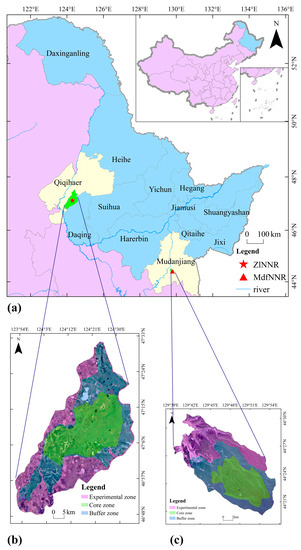 Location map of the study area. (a) Overview of the study area; (b) Zhalong National Nature Reserve (ZlNNR); (c) Mudanfeng National Nature Reserve (MdfNNR).