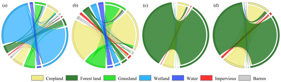 The land use change conversion situation in each study area from 2000 (left) to 2020 (right): (a) inside ZlNNR, (b) outside ZlNNR, (c) inside MdfNNR, (d) outside.