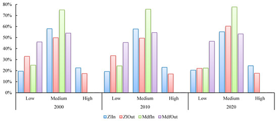 The patch level of the landscape pattern indexes of both NNRs are presented in Table 5 and Table 6. There was a negligible difference in the average values of PDP inside and outside ZlNNR. Notably, the LPIP and MPSP of inside wetland patches were much larger than those of outside wetland patches. Over the past 21 years, the change extents of the three indexes were larger outside wetland patches than those of the inside wetland. Conversely, the average values of LPIP and MPSP outside were generally more dwarf than those inside, especially for forest land types, and the average value of PDP outside MdfNNR was also generally larger than that inside. The change extent of PDP and LPIP values was generally greater outside than inside in MdfNNR, whereas the change extent of MPSP value shows the opposite trend, with the extent of change in outside indexes being smaller than that of the inside. Whether in ZlNNR or MdfNNR, in terms of patch shape, the average values of EDP and LSIP are generally higher outside than inside, and the variation ranges of the two indexes were the same.