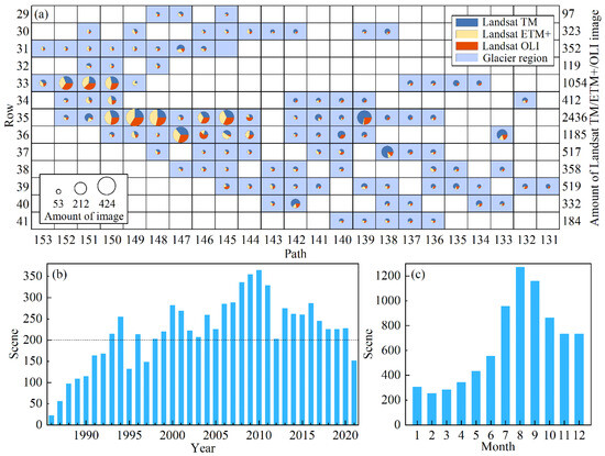 The Landsat satellite series is renowned for providing the longest and most comprehensive archive of Earth observation data [51,52]. This extensive dataset offers substantial support for analysing long-term glacier changes [4,14,23,34,40,41]. The imagery utilized in this study consists of Collection 1 Level-1 Landsat 5 Thematic Mapper (TM)/Landsat 7 Enhanced Thematic Mapper Plus (ETM+)/Landsat 8 Operational Land Imager (OLI) data from 1986 to 2021, which were obtained from the United States Geological Survey (USGS) website (https://earthexplorer.usgs.gov, accessed on 25 January 2022). The acquired images were individually compared, and images with minimal cloud cover, little snow, and a clearly identifiable glacier terminus were selected to extract glacier outlines. A total of 7909 Landsat images were obtained, involving 112 Landsat satellite paths and rows (Figure 2a). The dataset comprises a total of 3419 Landsat TM images, 2417 Landsat ETM+ images, and 2073 Landsat OLI images. Notably, the number of available images remained relatively low until 1990; however, it consistently exceeded 200 scenes per year thereafter, with only a few exceptions in certain years (1991, 1992, 1995, 1997, and 2021) (Figure 2b). Furthermore, there is a higher abundance of imagery during the summer months (July to September), while other months exhibit comparatively fewer acquisitions (Figure 2c). All images underwent radiometric and geometric correction, as well as topographic correction based on DEM data. Subsequently, colour composites were generated by combining visible bands of Landsat TM/ETM+/OLI (Landsat TM and ETM+: bands 5, 4, 3; Landsat OLI: bands 6, 5, 2) using the CompositeBands tool in ArcGIS 10.4 software. Moreover, pan-sharpened images with a spatial resolution of 15 m for Landsat ETM+/OLI were produced by fusing the colour composite with the panchromatic band using the CreatePansharpenedRasterDataset tool in ArcGIS 10.4 software. The above processes were batch-processed using Python code to enhance efficiency.