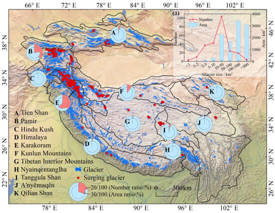 Distribution of surging glaciers in HMA. Figure (a) show the number and area of surging glaciers of different sizes.