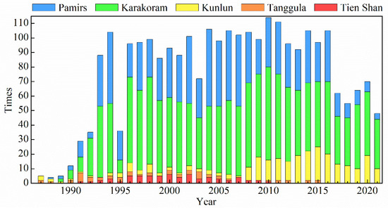 With the support of long-term time series remote sensing images, we quantified the advance frequency of each glacier. This will contribute to a better understanding of the surging process and characteristics of glaciers. The results show that from 1986 to 2021, a total of 2802 advance events occurred in 244 surging glaciers in HMA, exhibiting different spatiotemporal trends. Among different mountain regions in HMA, the highest number of surging glacier advances occurred in the Karakoram Mountains (1401), followed by the Pamirs (902) and Kunlun Mountains (261). The annual surge times occurring in 1993–2016 were all greater than 80. However, this phenomenon gradually decreased after the year 2016.