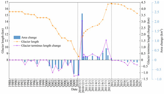 The accuracy of glacier length extraction depends on the precision of the extracted glacier outline and the quality of DEM data. Generally, the influence of the latter on glacier length is negligible [64,65]. Therefore, the spatial resolution of a remote sensing image remains as the sole error source that can be calculated by the following equation [40]: