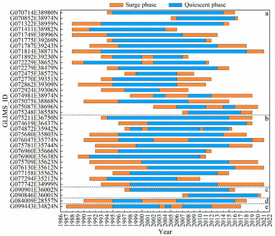 The surge phase, quiescent phase, and time of surge in different regions of HMA from 1986 to 2021. (The orange represents the surge phase, and the blue represents the quiescent phase; (a): Pamirs (b): Karakoram (c): Kunlun Mountains (d): Himalayas (e): A’nyêmaqên Mountain.)