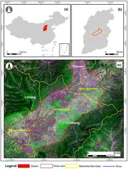 The location of the study area: (a) shows the Shanxi province in China, (b) shows the study area in Shanxi province, and (c) shows the study area illustrated on the GF-1 image on 29 April 2023, respectively.
