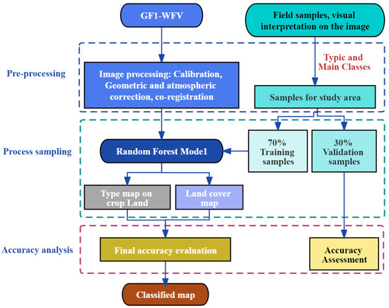 At the same period, the field data were collected. In general, these field data were not enough for the classification in terms of spatial distribution and statistical amount. In order to make well-spatially distributed training samples, these geotagged photos were linked with the satellite image to help skilled interpreters to visually identify more samples on satellite images. The classification samples corresponding to each image were separated into training and validation sets by a ratio of 70% to 30%.