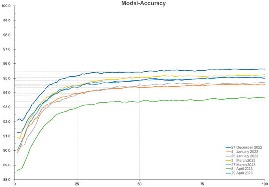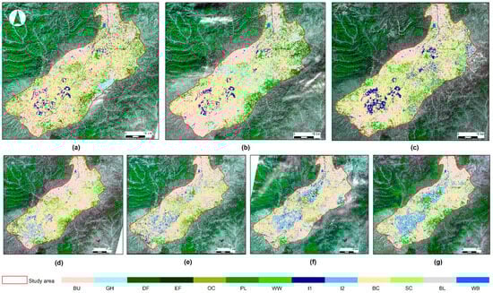 The classified images: (a) on 27 December 2022, (b) on 4 January 2023, (c) on 25 January 2023, (d) on 3 March 2023, (e) on 27 March 2023, (f) on 8 April 2023, (g) on 29 April 2023, respectively.