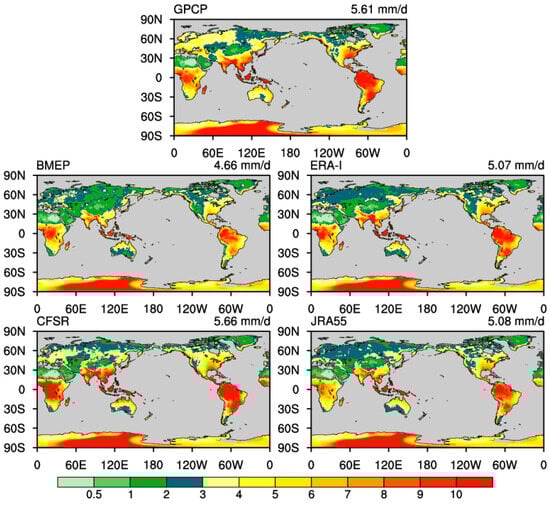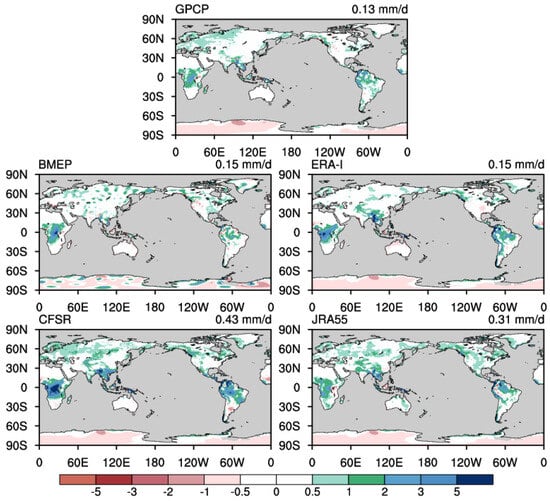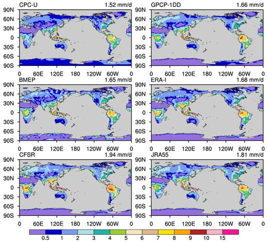 Publicly available datasets were analyzed in this study. The CPC-U data can be found here: https://climatedataguide.ucar.edu/climate-data/cpc-unified-gauge-based-analysis-global-daily-precipitation (accessed on 1 September 2023); the GPCP-1DD data can be found here: ftp.ncdc.noaa.gov//pub/data/gpcp/ (accessed on 1 September 2023); the BMEP data can be found here: http://bcc.ncc-cma.net/channel.php?channelId=132 (accessed on 1 September 2023); the CFSR data can be found here: https://rda.ucar.edu/datasets/ds093.0/ (accessed on 1 September 2023); the CFSv2 data can be found here: https://rda.ucar.edu/datasets/ds094.0/ (accessed on 1 September 2023); the ERA-I data can be found here: https://www.ecmwf.int/en/forecasts/dataset/ecmwf-reanalysis-interim (accessed on 1 September 2023); the JRA-55 data can be found here: https://rda.ucar.edu/datasets/ds628.0/ (accessed on 1 September 2023).